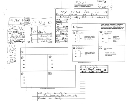 We read the essay, "Fishing with Grandpa," from the new book, Fun-Size Academic Writing for Serious Learning, (coming from Corwin at the end of the summer) and did the activity, using colors to find the four kinds of text. That resulted in four icons, four kinds of text, to begin a "writer's tools" list in the classroom. As they learn more, students can add to their own personal copy of icons in their journals .